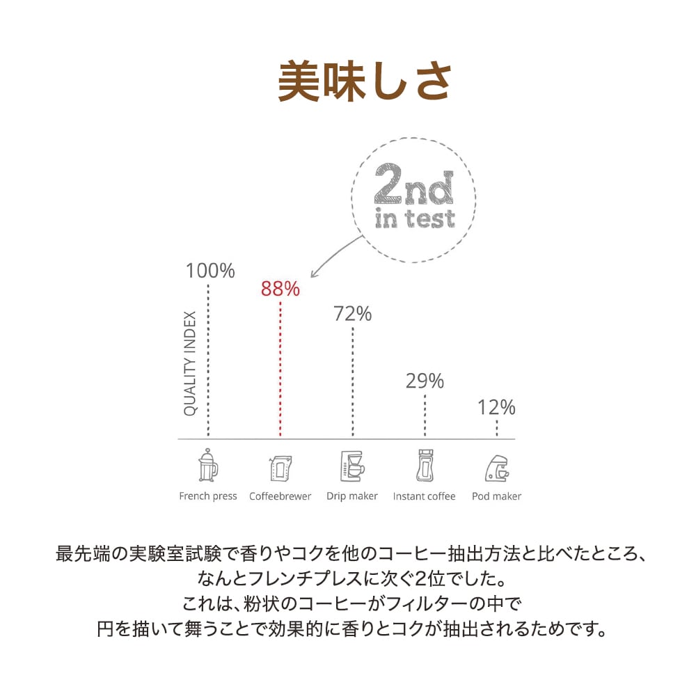 フレンチプレスやドリップで抽出したのと同じ「深みとコクのある美味しい品質」とインスタントコーヒーのようないつでもどこでもお湯だけで簡単に淹れることのできる「手軽さ」の2つが実現した画期的なアイテムです。