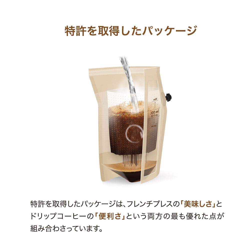 フレンチプレスやドリップで抽出したのと同じ「深みとコクのある美味しい品質」とインスタントコーヒーのようないつでもどこでもお湯だけで簡単に淹れることのできる「手軽さ」の2つが実現した画期的なアイテムです。