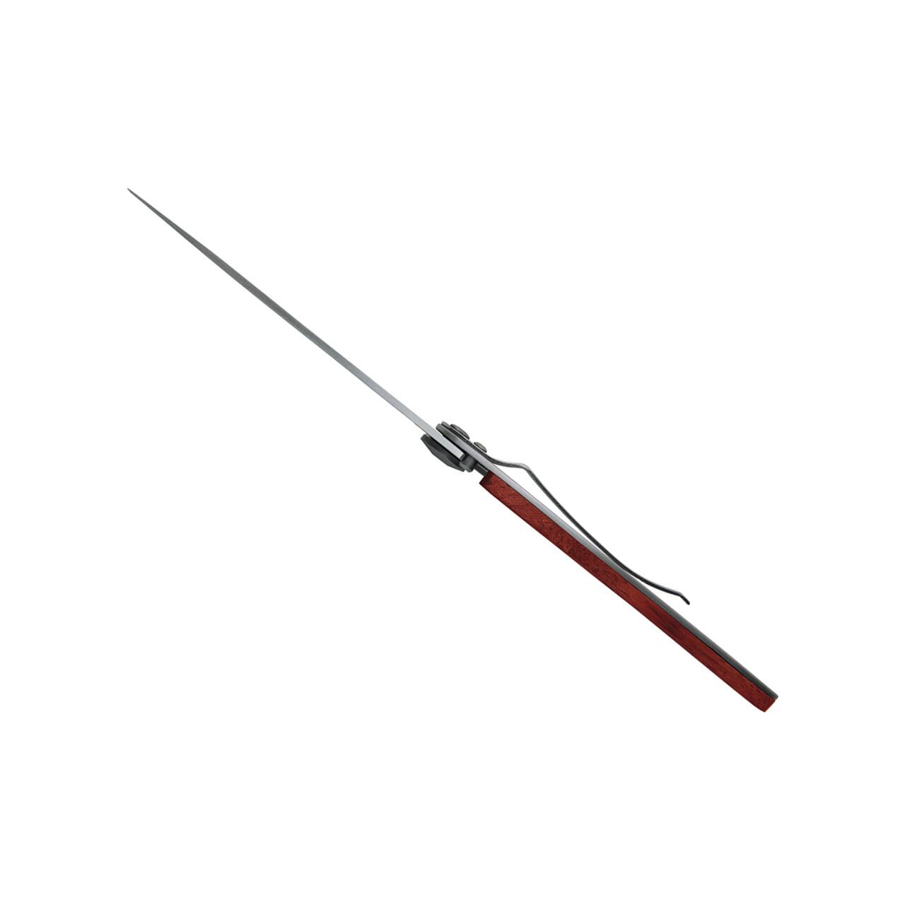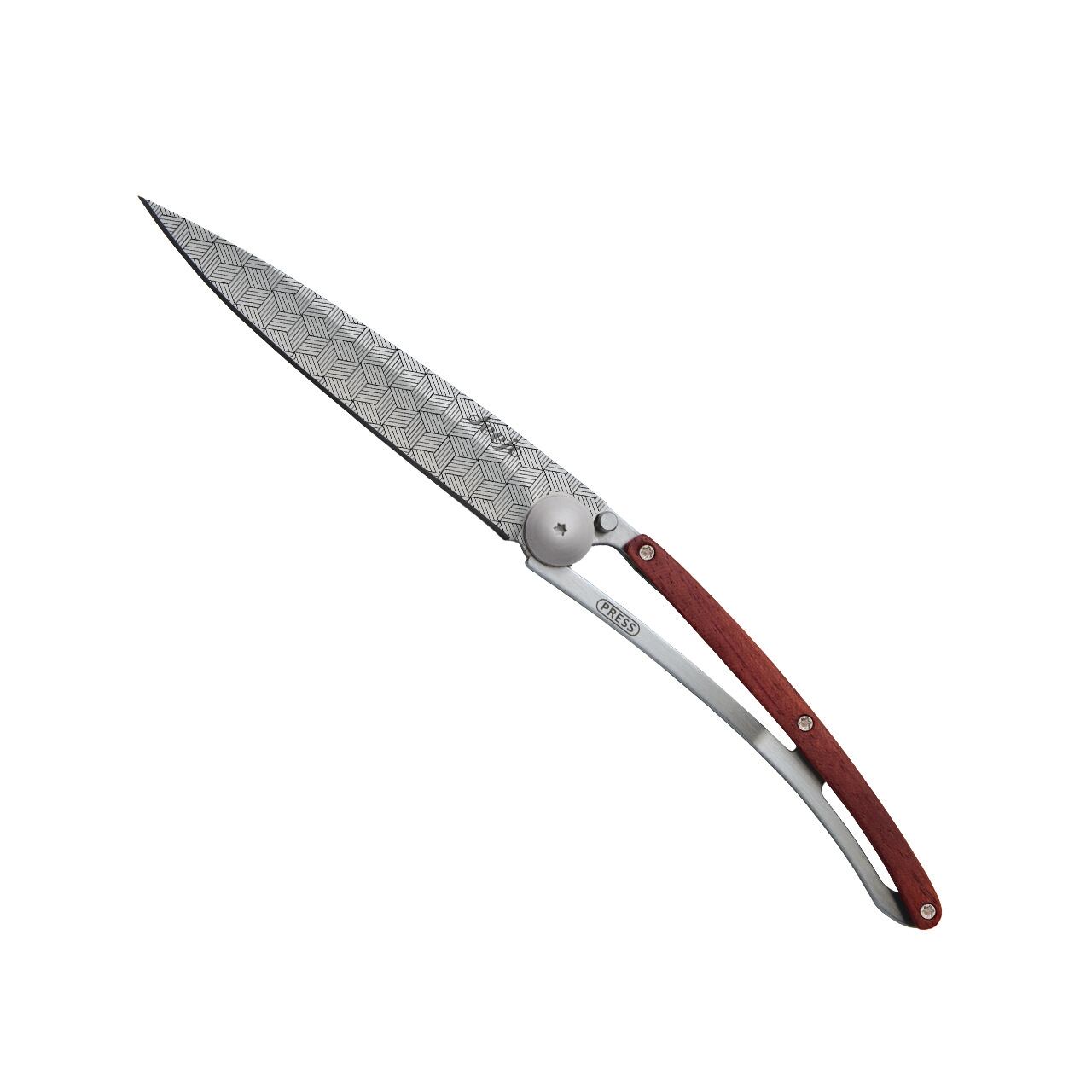 この Deejo ナイフは、無垢のコーラルウッドのハンドルプレートで装飾されています。この種の木材は、その絶妙な赤/琥珀色の反射 (そのためこの名前が付けられています)、堅牢性、優れた耐湿性のため、長い間カトラリーに使用されてきました。ここでは、それが Deejo ナイフの優雅さを素晴らしく強調しています。
